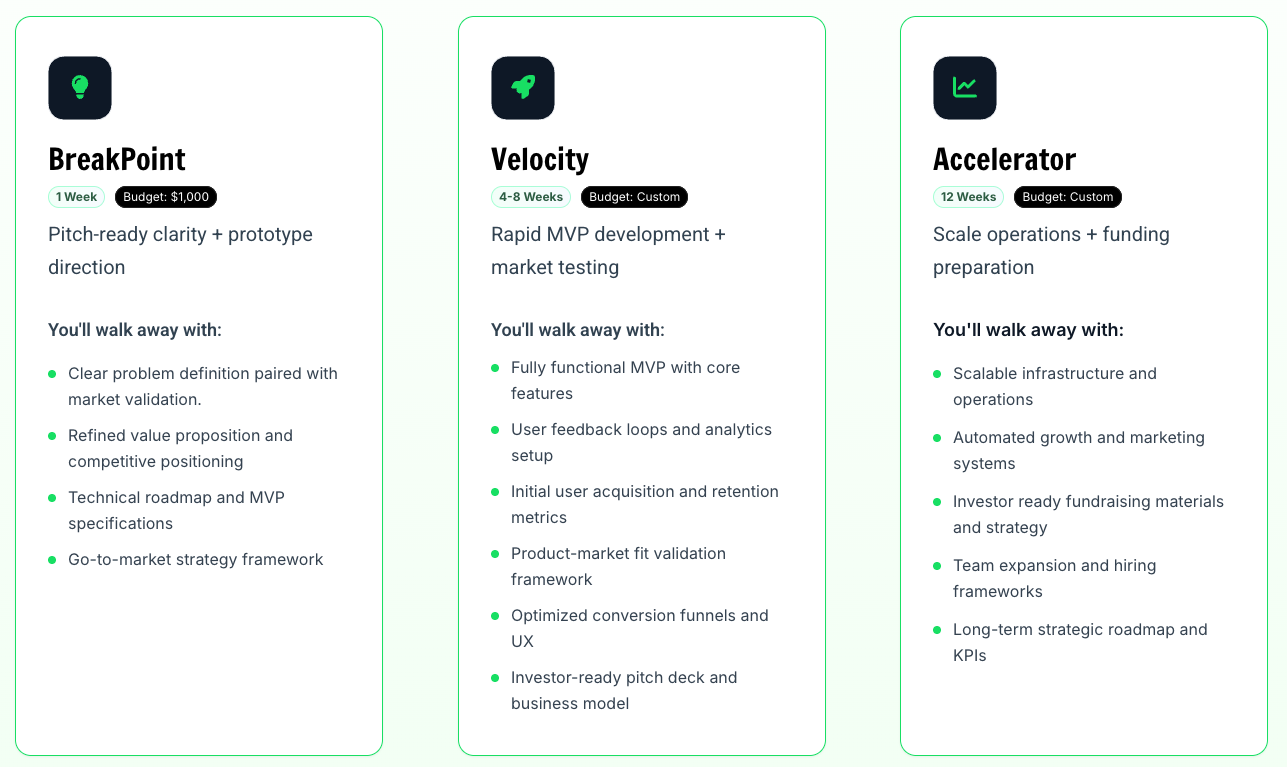 Ignition was designed for early-stage founders who are actively building and looking for hands-on support to work through the real challenges of turning an idea into a sustainable business. Rather than focusing on pitch decks, demo days, or one-size-fits-all acceleration, Ignition works closely with founders to solve the critical business breakpoints that determine long-term success.